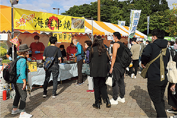 広い芝生スペースにおいしい・楽しいが盛りだくさん!ゲームや手づくり体験を楽しんだり、町会・自治会や協賛団体の皆さんのブースでおいしいものをたくさん食べられます。区民ふれあいステージでは、区内のアマチュアバンドの演奏やダンスを楽しめます。
