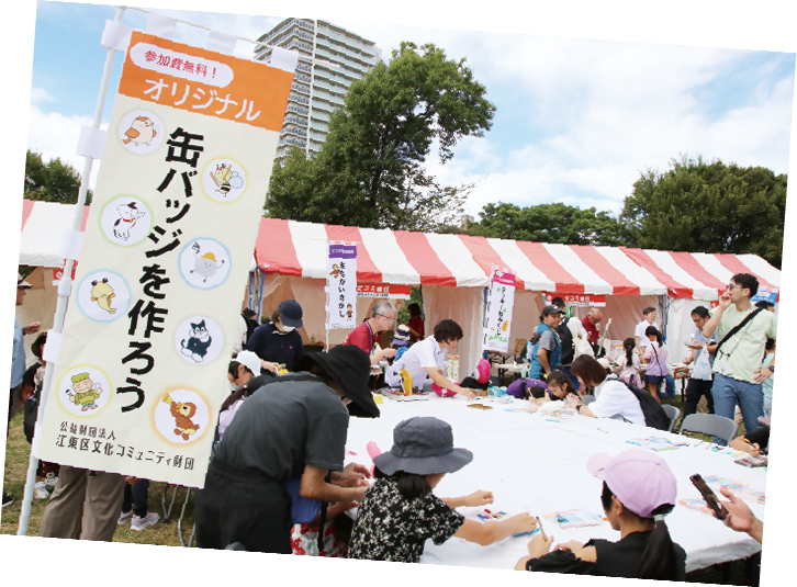 広い芝生スペースにおいしい・楽しいが盛りだくさん!ゲームや手づくり体験を楽しんだり、町会・自治会や協賛団体の皆さんのブースでおいしいものをたくさん食べられます。区民ふれあいステージでは、区内のアマチュアバンドの演奏やダンスを楽しめます。