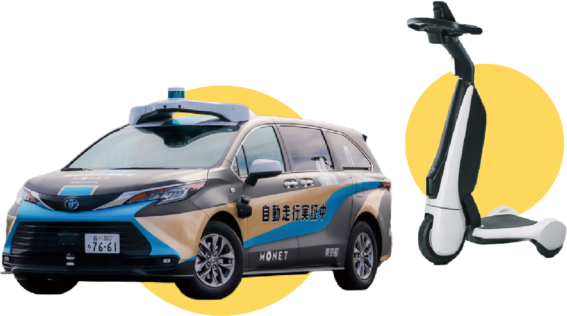 (注釈)(立ち乗り型・スクーター型)に乗って園内コースを回ろう!CG動画で乗換拠点「モビリティハブ」についても学べます。
