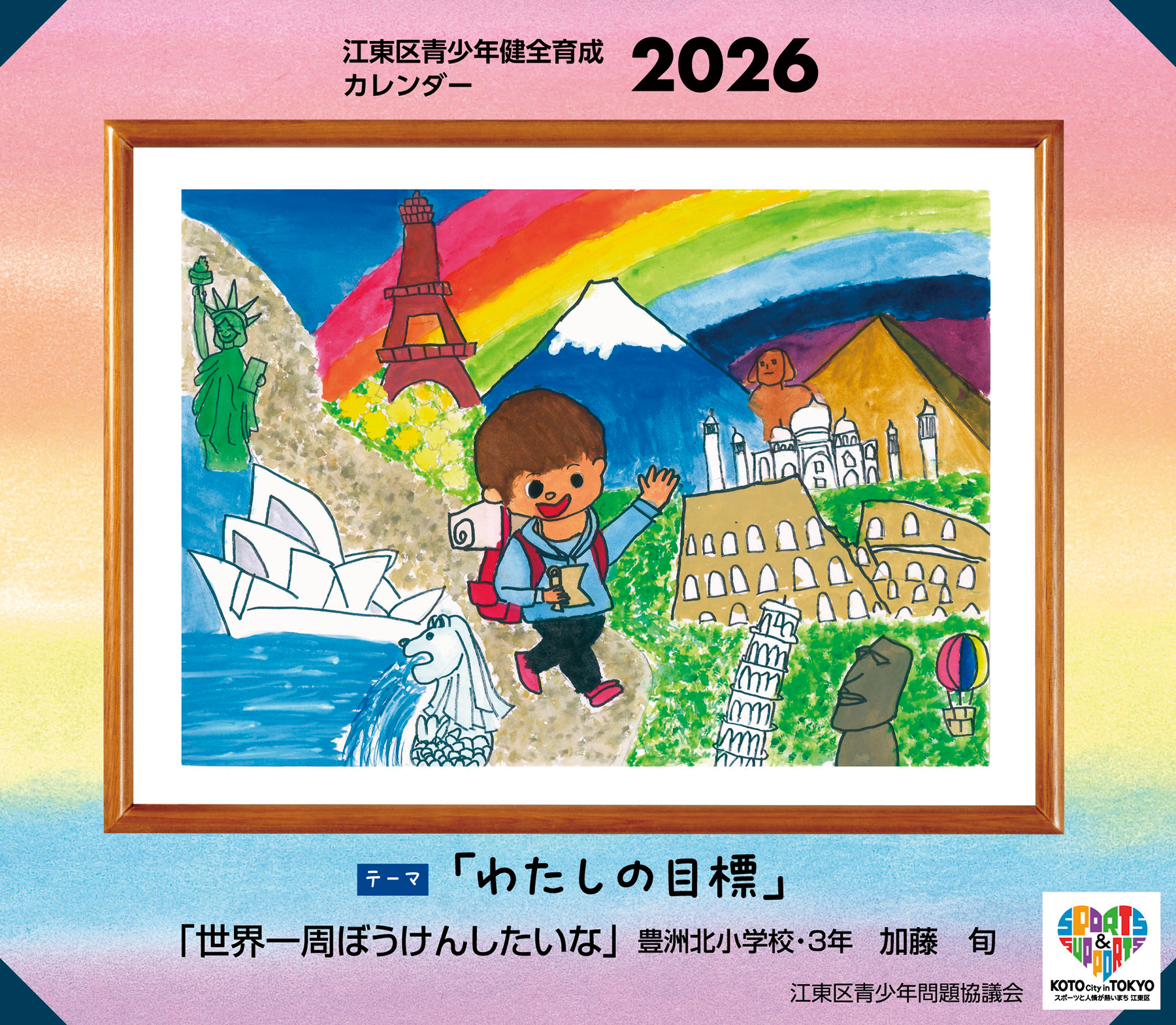 今回のテーマは「わたしの目標」です。区立小・中・義務教育学校合わせて767点の応募をいただき、その中から入選した作品を掲載しています。児童・生徒の想いがあふれる作品でつくったカレンダーをぜひご活用ください。