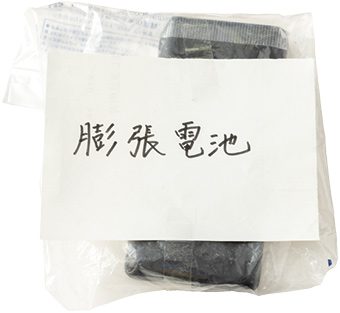 膨張・変形している電池は、単体で袋に入れ「膨張電池」と表示して「燃やさないごみの日」に出す