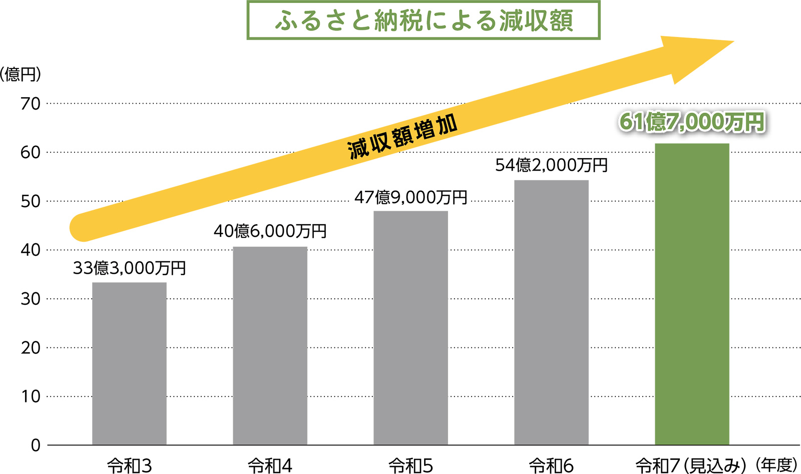 ふるさと納税の区財政への影響は年々増加し、令和7年度の減収見込み額は、約61億7,000万円となり、これは学校1校の建て替え費用や、日々のごみ収集などにかかる経費の約3年分に相当します。このまま減収額が増加し続ければ、区民サービスの低下を引き起こしかねません。
