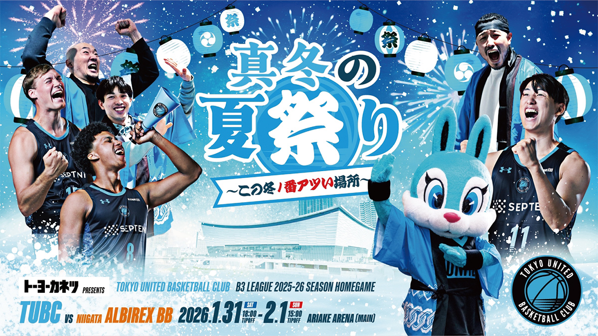 有明アリーナで開催される、東京ユナイテッドバスケットボールクラブ(TUBC)のホームゲーム(vs新潟アルビレックスBB)に招待・優待します。トップレベルのスポーツを体感できる絶好のチャンスです!この機会にぜひ現地で応援してみませんか。詳細はTUBC ホームページをご覧ください。