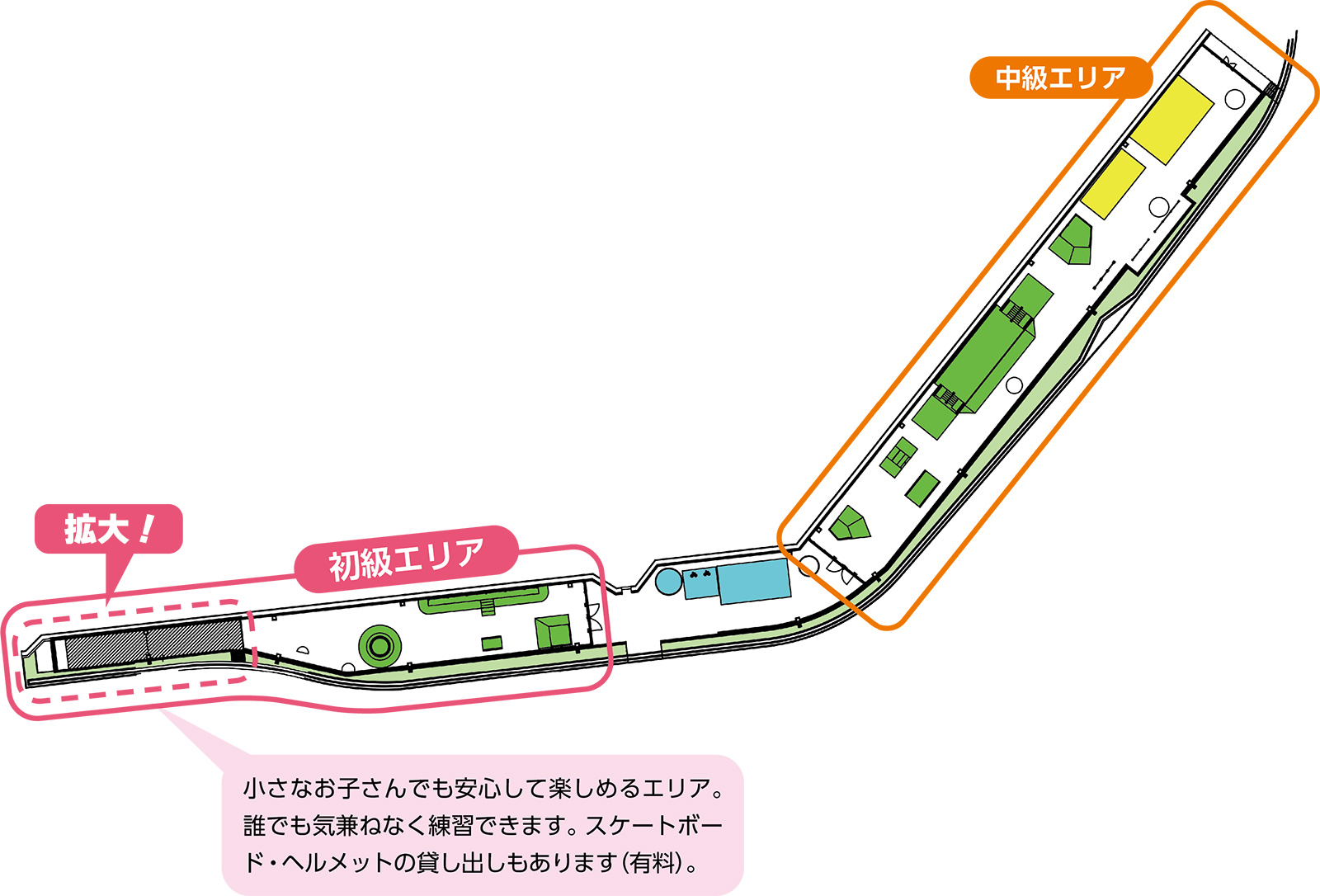初めてスケートボードに挑戦する人も安心して利用できる「初級エリア」が広くなりました!また、中級エリアもセクションを改修。初心者からベテランまでより長く楽しめる施設にリニューアルしました!