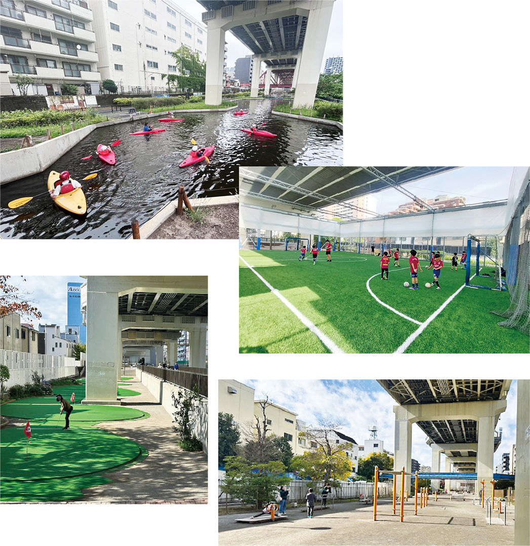 全長2.4km、総面積7.48haの首都高速道路7号線の高架下にある公園です。カヌー・カヤック場、フットサルコート、パターゴルフ場、健康遊具、水上アスレチックなどがあり、こどもから大人まで、雨を気にせず多彩なスポーツやアクティビティを楽しめます。