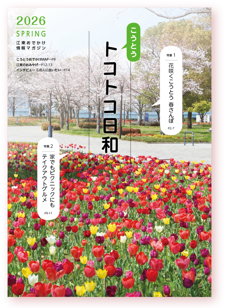 今回は「花咲くこうとう 春さんぽ」と「家でもピクニックにも テイクアウトグルメ」の2つを大特集。桜をはじめ、チューリップ、