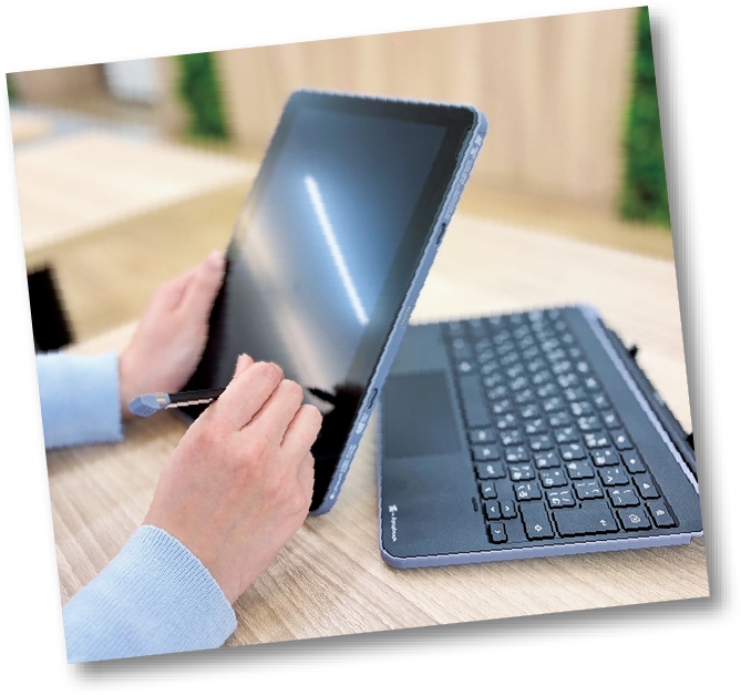 区立小中学校等のこどもたちに学習用ICT端末を貸与しています。4月から新しい端末になり、画面とキーボードが取り外せ、軽く持ち運びやすいタブレットとしても使えます。