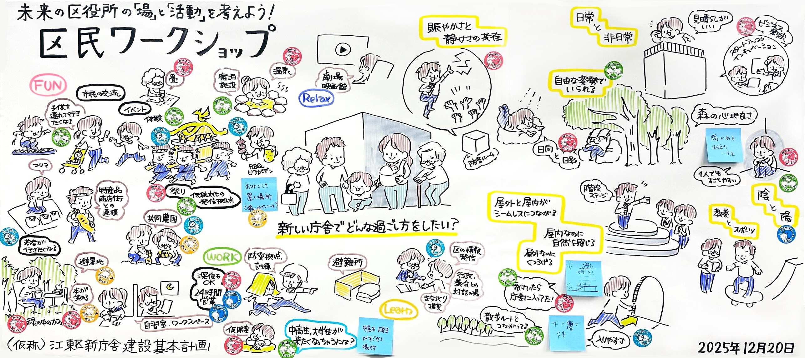 令和7年12月20日(土曜日)に、区民ワークショップを開催し、区民交流機能や複合化の検討について、区民目線で「庁舎にどんな機能があるといいのか」、「庁舎でどのような活動をしたいか」など実際に利用する区民の思いやアイディアを伺いました。