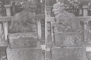 社殿玉垣の前に置かれている。阿形像の総高146センチ、像高64センチ、吽形像の総高146.5センチ、像高64センチ。石質は安山岩。両像ともに足元に子犬があらわされている。