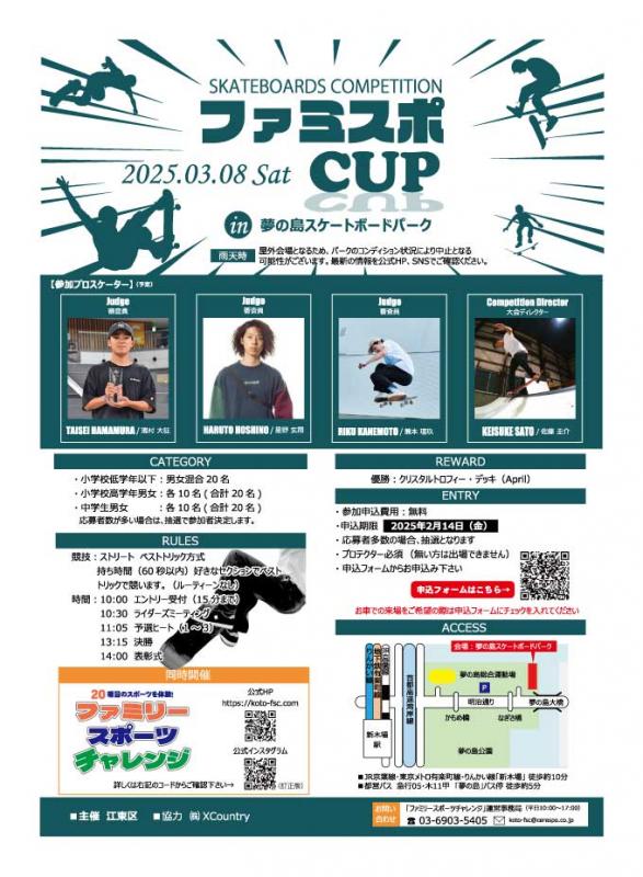 スケートボード体験会、堀米雄斗選手展示コーナー、スケートボードコンテスト「ファミスポCUP」
