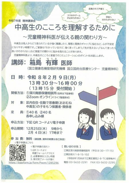対象:区内在住・在勤の方で思春期(おおむね中高生)の子を持つ保護者・関係者