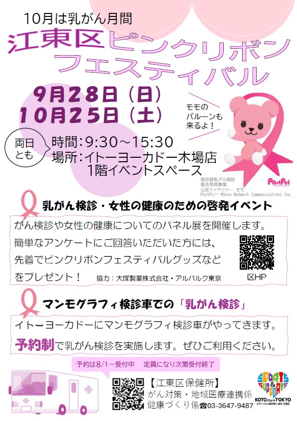 乳がん月間に合わせ、イトーヨーカドー木場店にて、マンモグラフィ検診車での乳がん検診を実施します。
