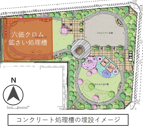 再開発区域内を含め大量に投棄されていた「六価クロム鉱さい」は、東京都の指導の下に工場跡地内で処理が行われていましたが、昭和の終わり頃にはこの工場跡地の処理容量も限界に達しました。そのため、区域内の都有地を処理地とし、コンクリート製の処理槽を地下に設置し、これに「六価クロム鉱さい」を封じ込めることとなり、平成12年5月にようやく処理は終了しました。