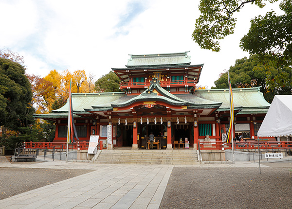 1642(寛永19)年、徳川家綱の成長を祈念して実施されたことが始まりである例大祭。1643(寛永20)年より神輿渡御が始まりましたが、当時は八幡宮の神輿と氏子の山車が町内を練り歩いていました。現在では三年に一度の本大祭の際に八幡宮の神様が乗られた御鳳輦が渡御(写真右下)し、そのお礼として町内の神輿渡御が行われています。担ぎ手へのお浄めとして水をかける「水かけ祭り」としても知られています。